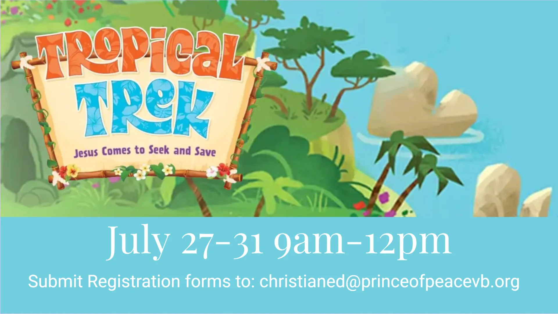 Grab your backpack and get ready for an unforgettable island adventure at our 2026 Tropical Trek VBS! Kids will journey through exciting tropical settings—like volcanoes and island caves—while discovering that Jesus came to “seek and save the lost” (Luke 19:10). Each day is filled with engaging Bible stories, lively music, creative crafts, and fun games that remind children they are never alone—God finds them, loves them, and gives them hope in every situation. Join us for a week of faith, fun, and life-changing discovery!